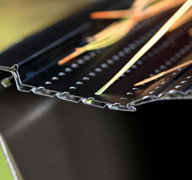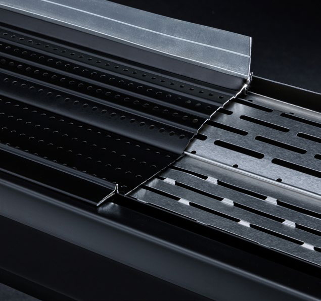 This innovative design features a perfect combination of two perforated aluminum membranes: the lower layer with large oblong openings, the upper layer with micro-perforations precisely offset creating the perfect filter.